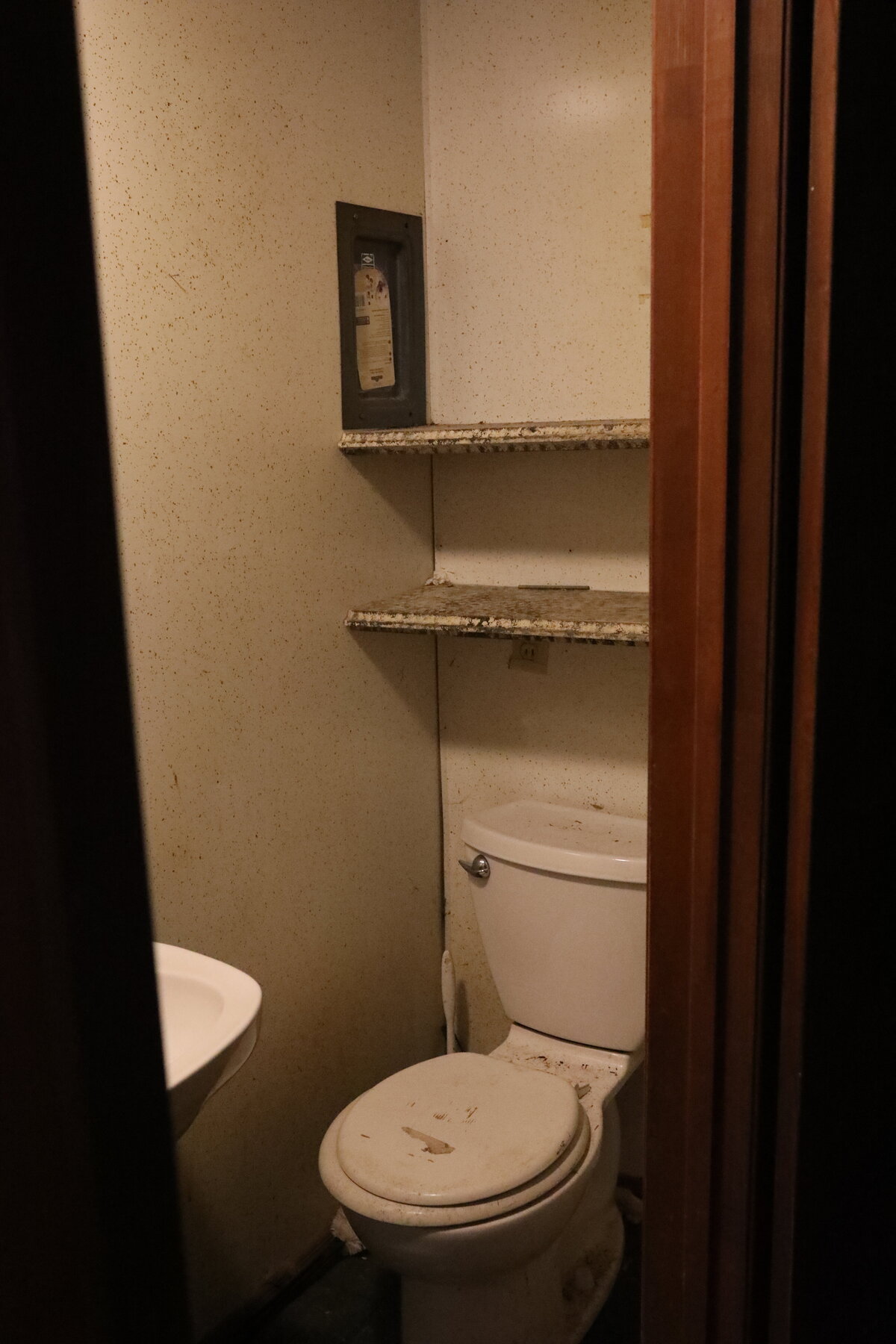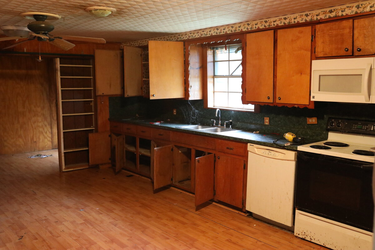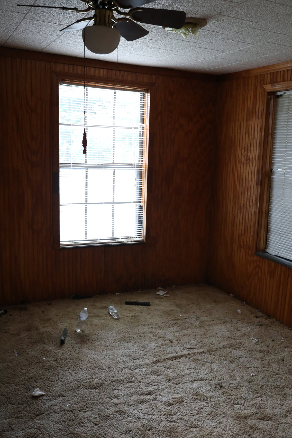 This house was what most folks would consider unliveable. The water was off due to multiple leaks and the house had an awful smell. At some point a garage had been attached to the house and later enclosed - the back rooms of this space opened outside and were used to store outdoor items.